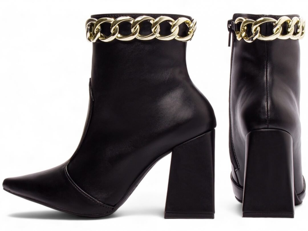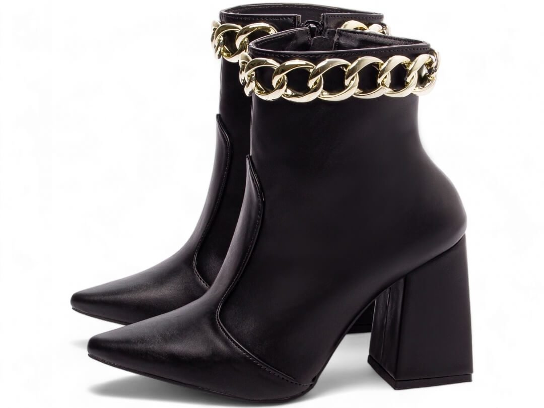 O bico fino desta bota alonga a silhueta, criando uma aparência elegante e feminina. O cano médio proporciona um ajuste confortável e seguro, enquanto o salto grosso oferece estabilidade e conforto durante todo o dia.