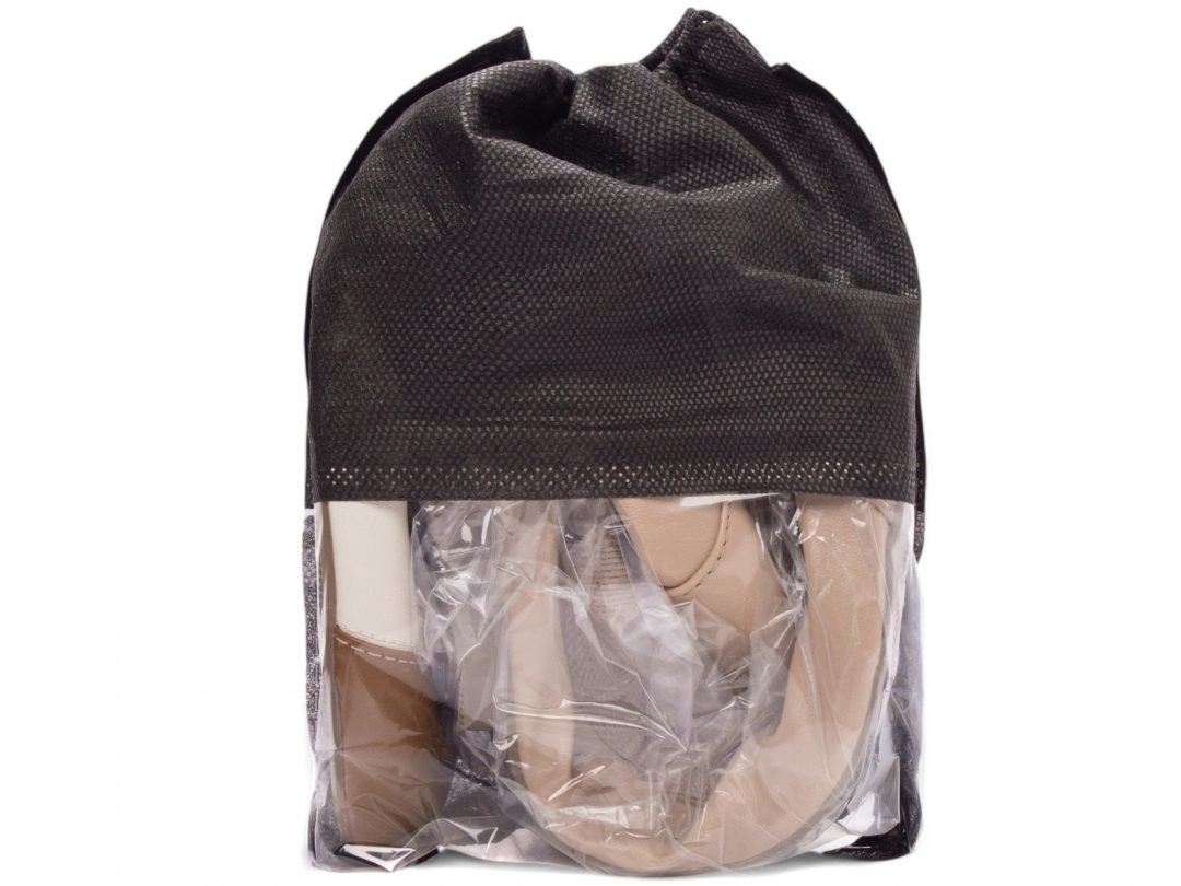 * A sapatilha vai dobrada dentro de um saco de material TNT na cor preto.