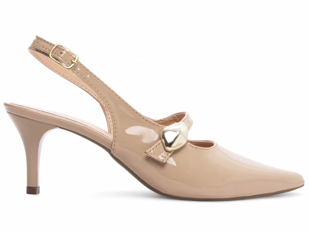 Com um acabamento em tom bege, o scarpin apresenta um visual neutro que combina facilmente com uma variedade de roupas. O aplique dourado adiciona um toque de glamour, elevando o estilo da peça e tornando-a perfeita para quem deseja se destacar. O design clássico do scarpin, aliado ao salto fino médio, garante um visual atemporal e elegante.